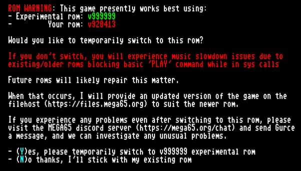 NOTE: The game presently needs my v999999 experimental rom (provided on disk) that it will offer to load up via the boot menu. Just click “Y” (yes) to accept updating to this experimental rom.